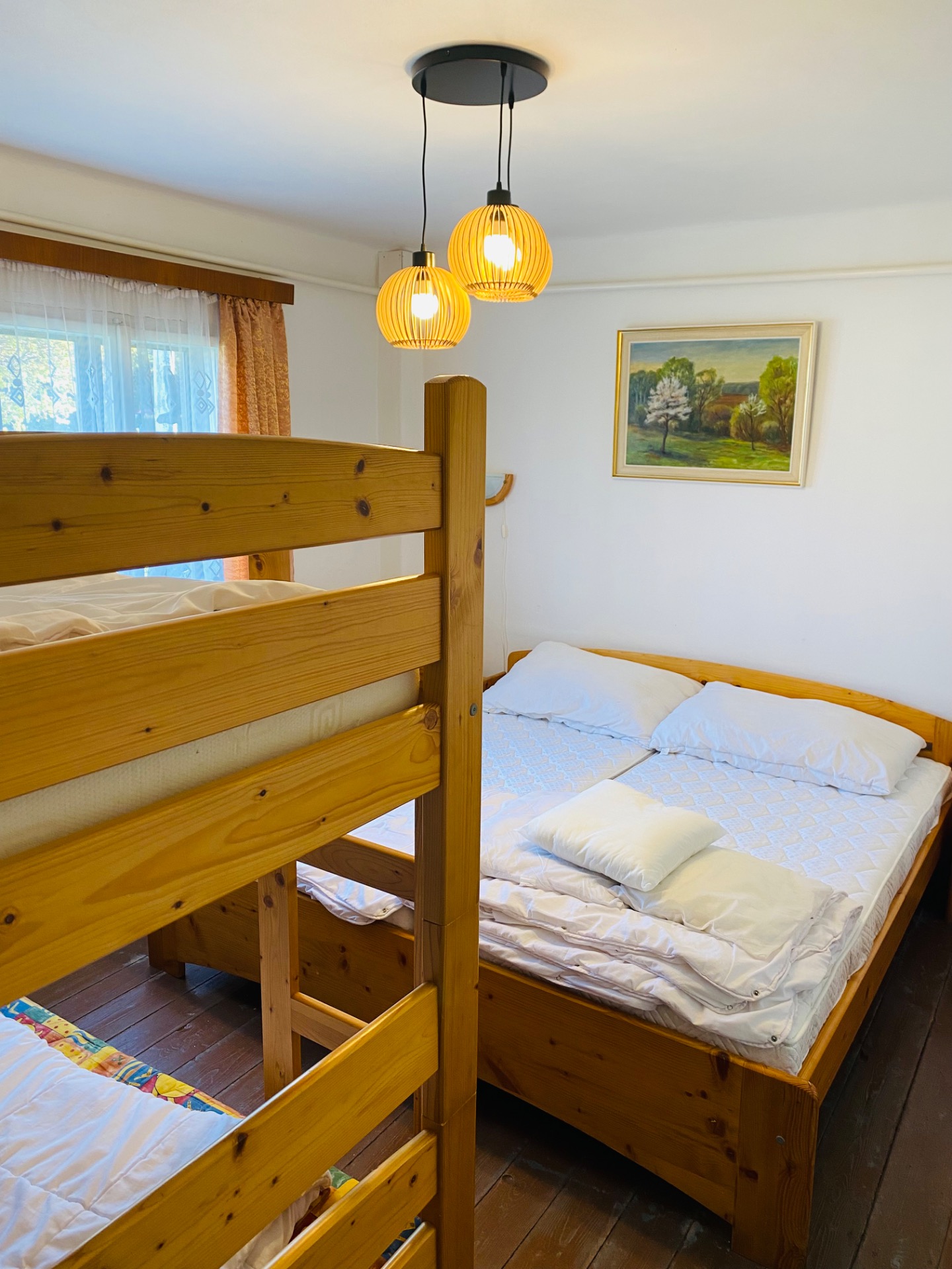 V jedné je manželská postel🛌 a palanda a v druhé další dvojpostel 🛌a jednolůžko.