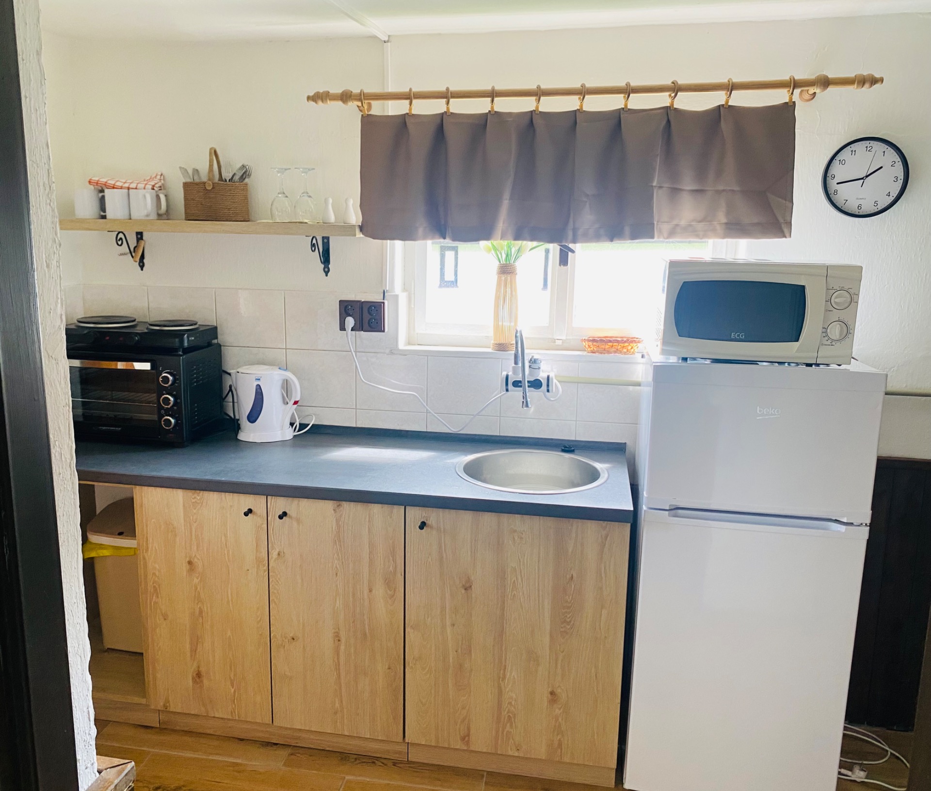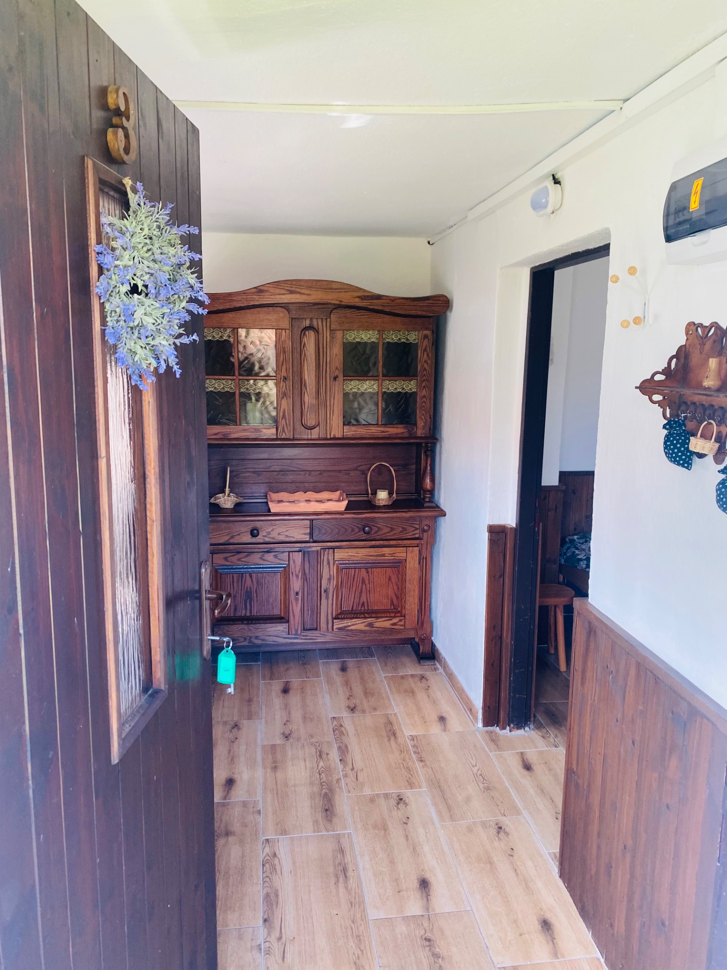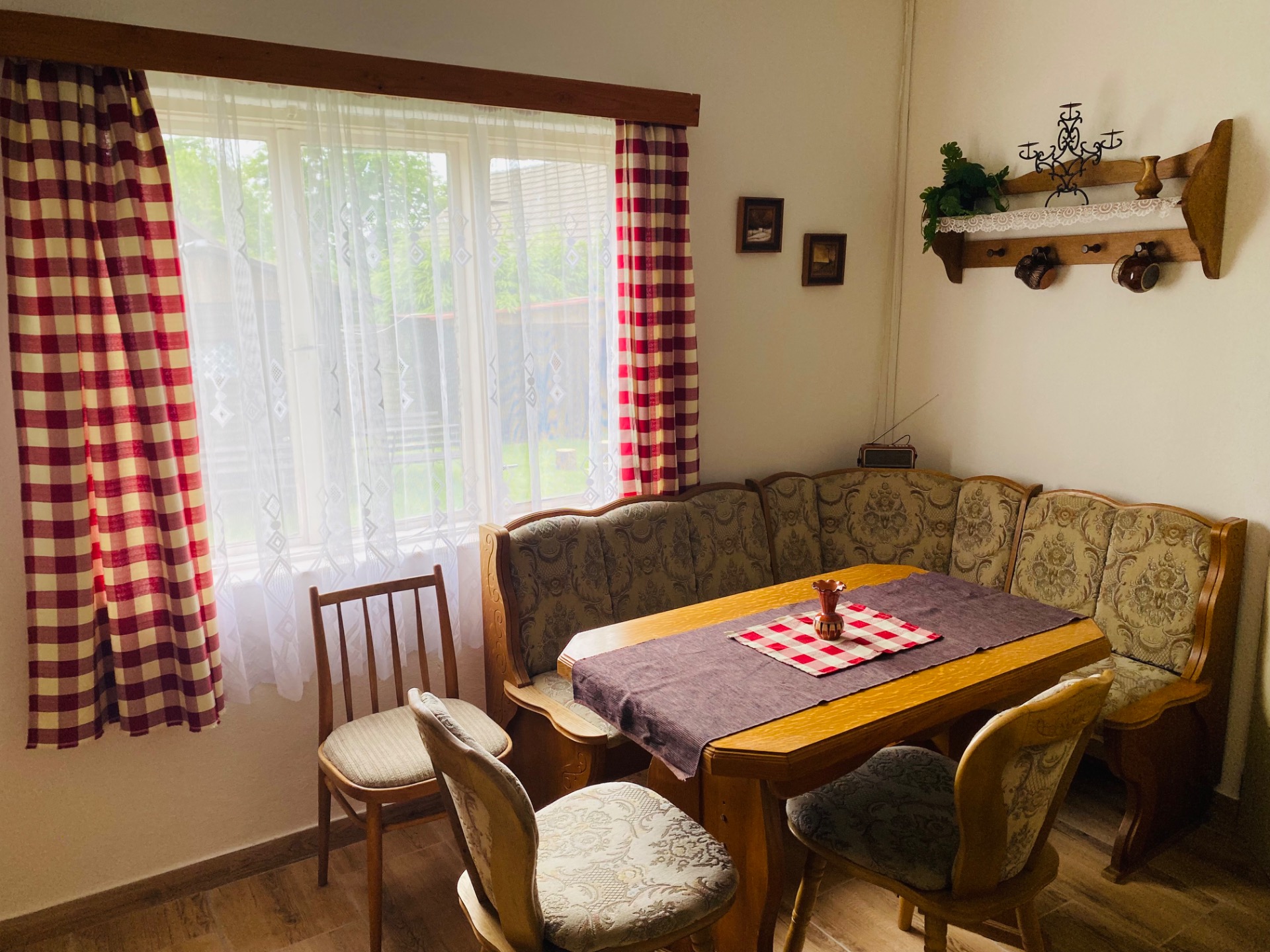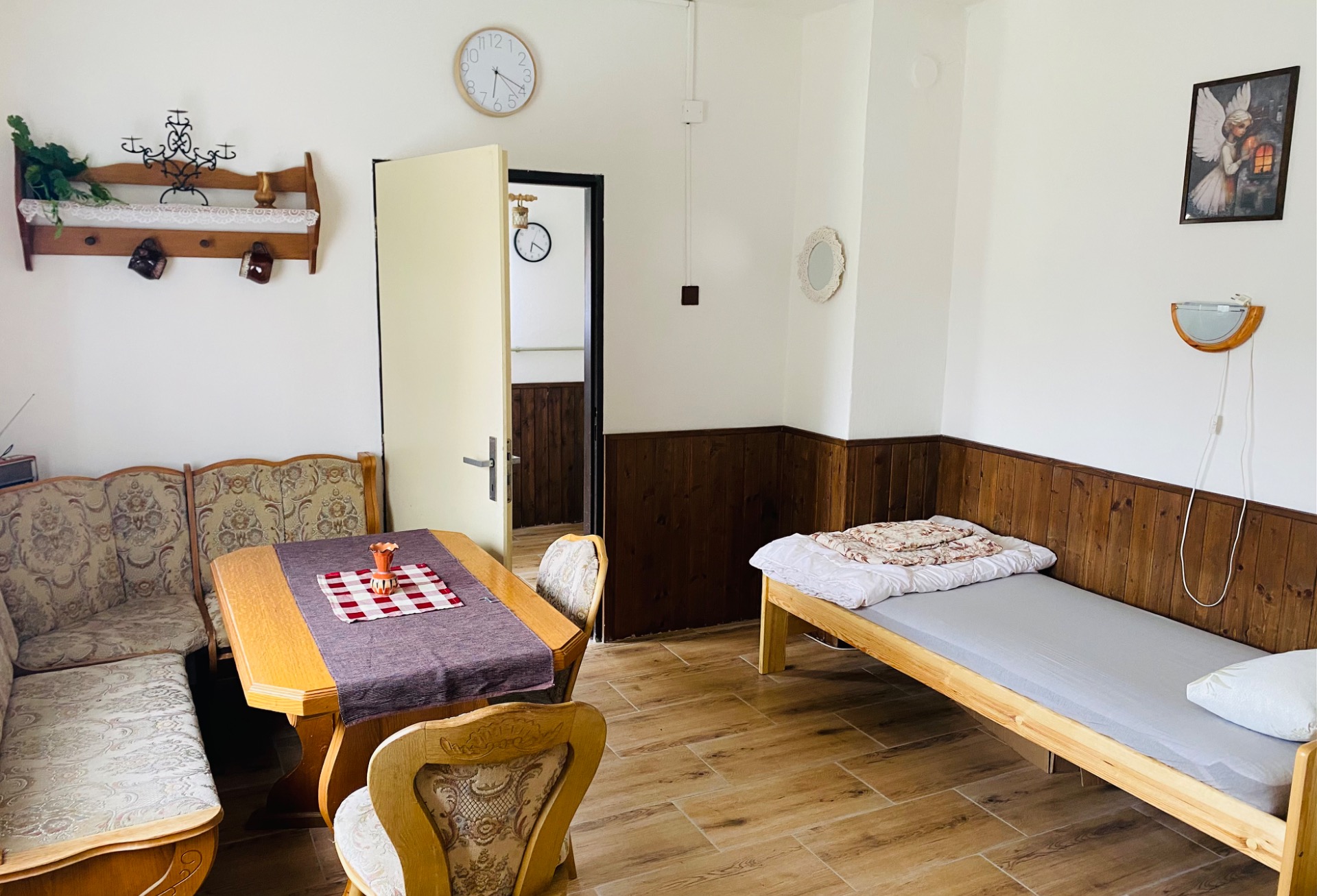 V další místnosti se nachází jídelní stůl a plně zařízený kuchyňský kout - lednice, dvouplotýnkový vařič, mikrovlnná trouba,trouba, varná konvice a běžné nádobí (skleničky, hrníčky, talíře, příbory a hrnce).Je zde televize.