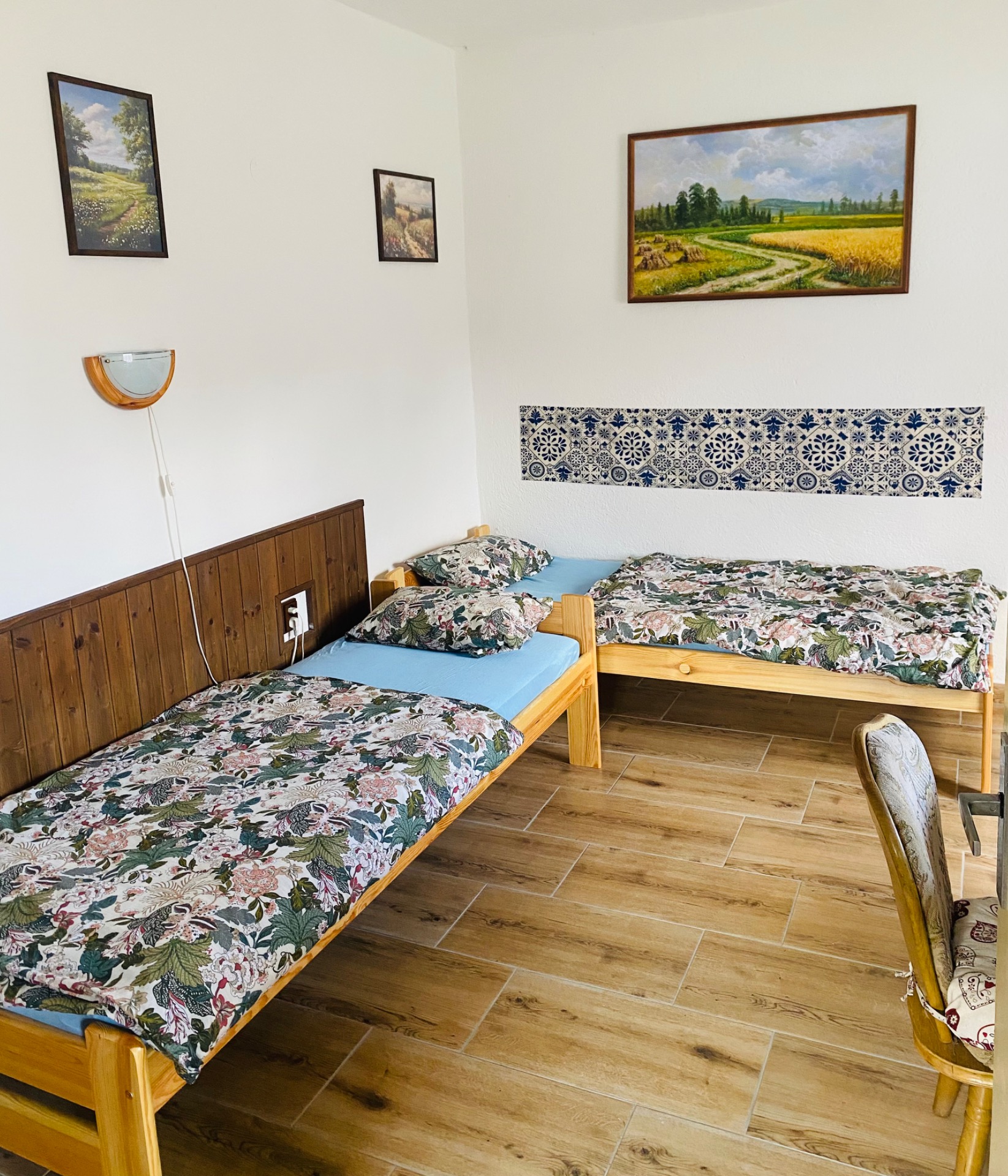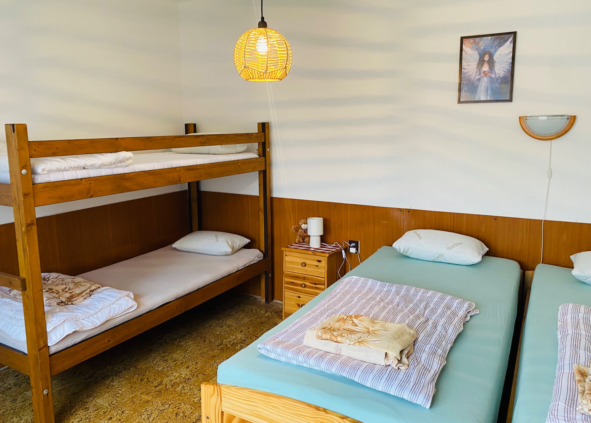 V jedné je manželská postel a palanda a v druhé dvě jednolůžka a rohová